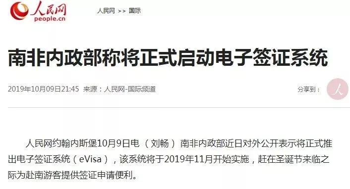 南非內(nèi)政部今年7月表示,將于今年11月正式推出電子簽證系統(tǒng)(eVisa),以便趕在圣誕節(jié)來臨之際為赴南游客提供證簽證申請便利。不過目前官方還未給出詳細(xì)實施時間和細(xì)則。