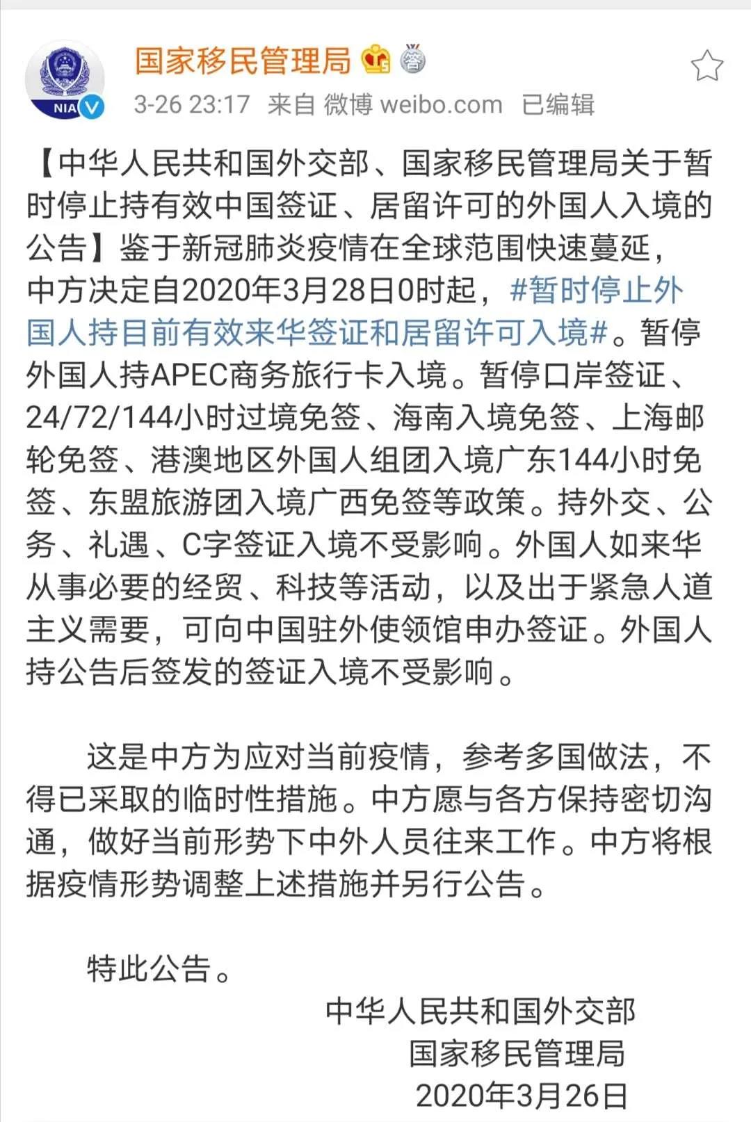 鑒于新冠肺炎疫情在全球范圍快速蔓延,中方?jīng)Q定自2020年3月28日0時(shí)起,暫時(shí)停止外國人持目前有效來華簽證和居留許可入境。暫停外國人持APEC商務(wù)旅行卡入境。暫?诎逗炞C、24/72/144小時(shí)過境免簽、海南入境免簽、上海郵輪免簽、港澳地區(qū)外國人組團(tuán)入境廣東144小時(shí)免簽、東盟旅游團(tuán)入境廣西免簽等政策。持外交、公務(wù)、禮遇、C字簽證入境不受影響。外國人如來華從事必要的經(jīng)貿(mào)、科技等活動(dòng),以及出于緊急人道主義需要,可向中國駐外使領(lǐng)館申辦簽證。外國人持公告后簽發(fā)的簽證入境不受影響。