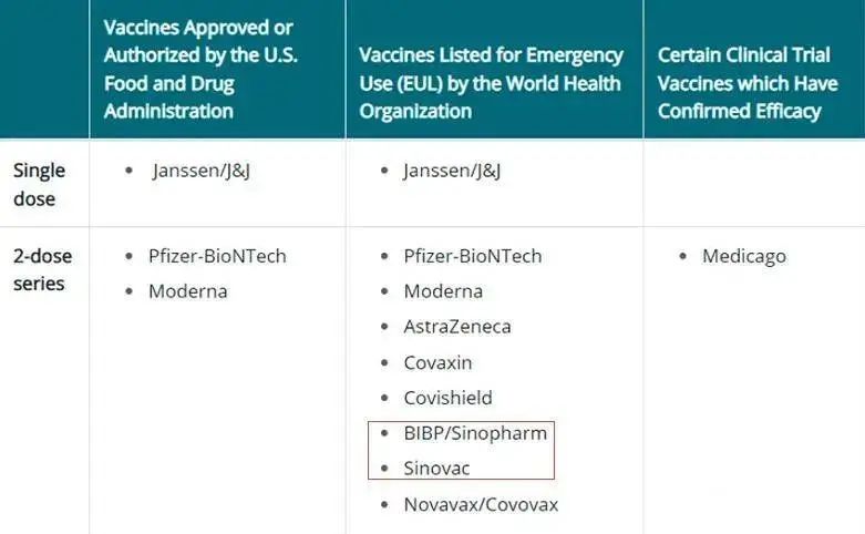 目前,美國接受的疫苗類型包括中國BIBP/Sinopharm(國藥疫苗)和Sinovac(科興疫苗)。