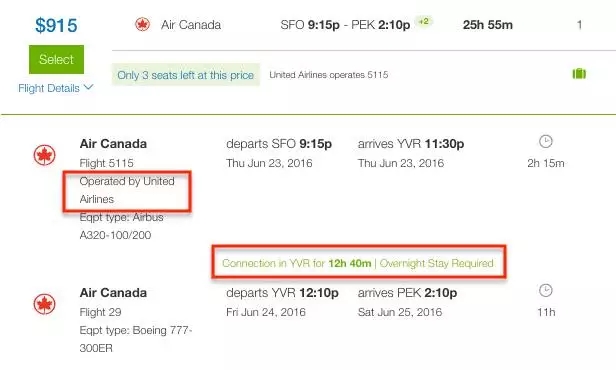 像以上截圖,雖然航空公司寫的是Air Canada,但是注意,它實際上是 Operated By United Airlines,則不符合免過境簽的要求,所以一定一定要看清楚承運(operated by)的航空公司。!(BY-StudentUniverse)