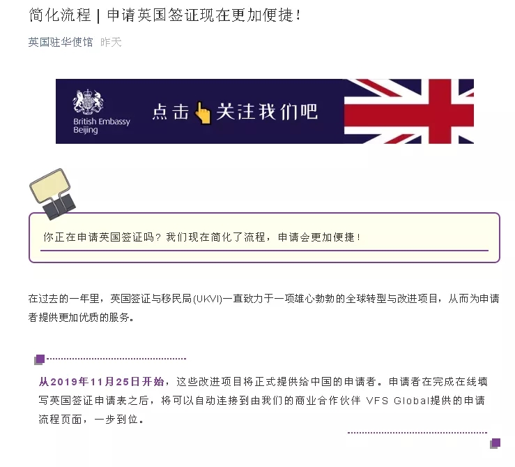 從2019年11月25日開始,這些改進(jìn)項(xiàng)目將正式提供給中國的申請者。申請者在完成在線填寫英國簽證申請表之后,將可以自動連接到由我們的商業(yè)合作伙伴 VFS Global提供的申請流程頁面,一步到位。
