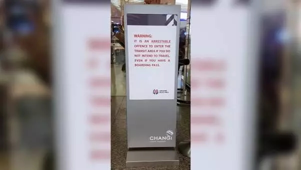 樟宜機場內(nèi)警示牌,警告乘客不要非法進(jìn)入中轉(zhuǎn)區(qū)。(圖源:新加坡警方)