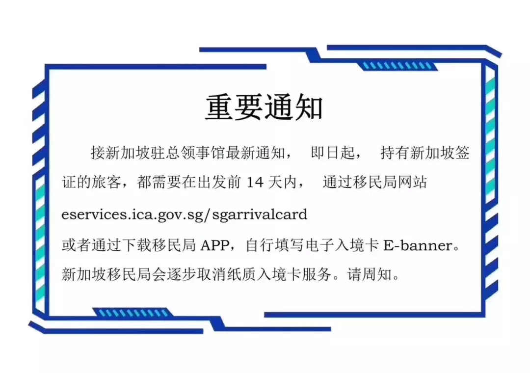 新加坡總領(lǐng)事館發(fā)布了最新消息,即日起,持有新加坡簽證的旅客,都需要在出發(fā)前14天內(nèi),通過(guò)移民局網(wǎng)站,https://eservices.ica.gov.sg/sgarrivalcard或者通過(guò)下載移民局APP,自行填寫電子入境卡E-banner,新加坡移民局會(huì)逐步取消紙質(zhì)入境卡服務(wù)。