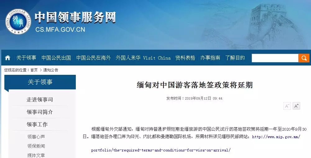 根據(jù)緬甸外交部通知,緬甸對持普通護(hù)照短期赴緬旅游的中國公民試行的落地簽政策將延期一年至2020年9月30日。