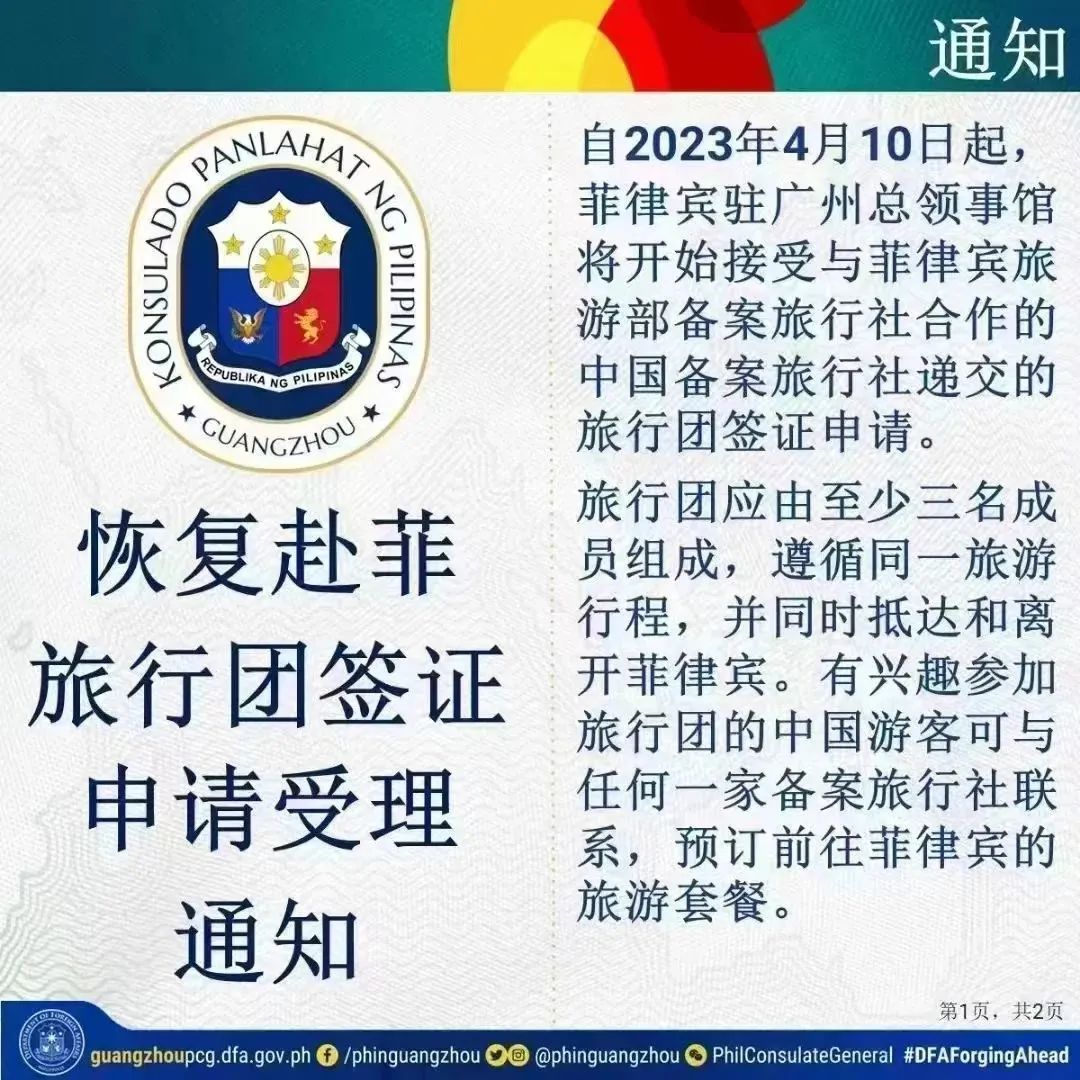 自2023年4月10日起菲律賓駐廣州總領(lǐng)事館將開始接受與菲律賓旅游部備案旅行社合作的中國備案旅行社遞交的旅行團(tuán)簽證申請。