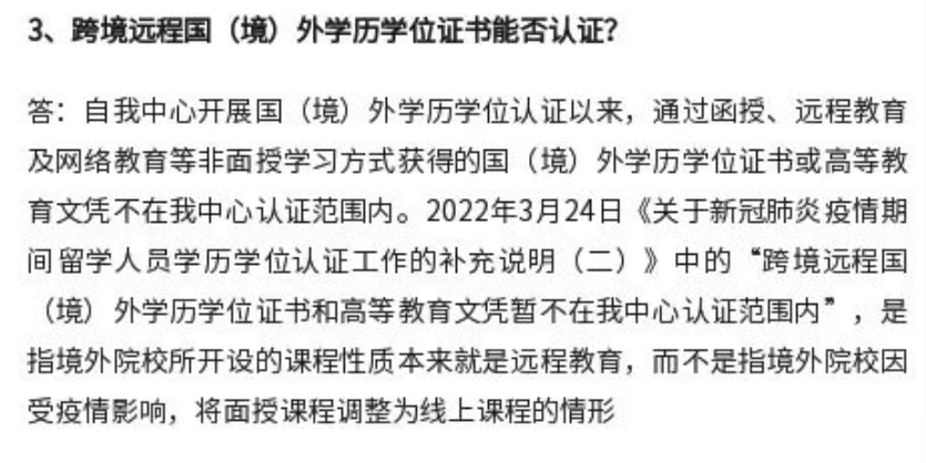 據(jù)官方回應(yīng),說明中所稱的跨境遠(yuǎn)程學(xué)習(xí)授課模式,是指學(xué)校的課程設(shè)置、學(xué)習(xí)方式等與疫情無關(guān),本身就只開設(shè)了online課程,如果選擇了這種網(wǎng)課,那認(rèn)證是無法受理的。如果學(xué)生選擇的是正常的線下面授課程,由于疫情影響而導(dǎo)致課程變?yōu)榫上進(jìn)行,是不影響認(rèn)證的。