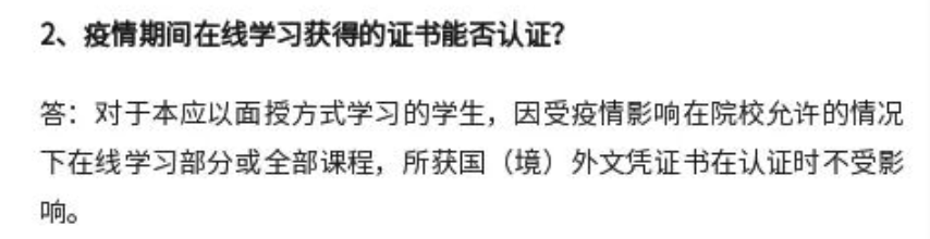 2020年4月,教育部留學(xué)服務(wù)中心發(fā)布聲明稱,受疫情防控影響,留學(xué)人員無法按時(shí)返校而選擇通過在線方式修讀部分課程,以及因此導(dǎo)致的其境外停留時(shí)間不符合學(xué)制要求的情況,不作為影響其獲得學(xué)位學(xué)歷認(rèn)證結(jié)果的因素。