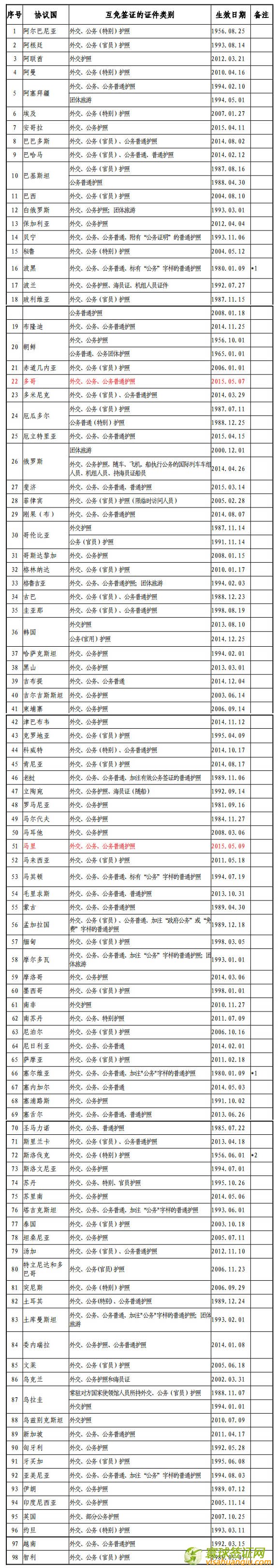 中國(guó)與外國(guó)互免簽證協(xié)定一覽表(2015年5月9日更新)