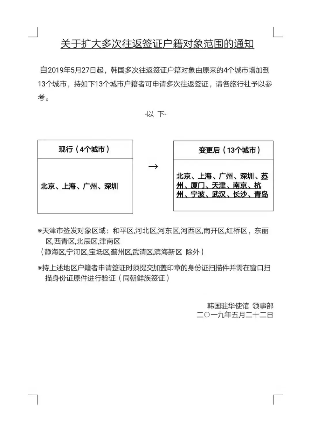 新政策于5月27日下周一正式實(shí)行!繼青島領(lǐng)事館發(fā)布通知后,韓國(guó)駐華使館和上海領(lǐng)事館也正式發(fā)布了通知!