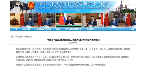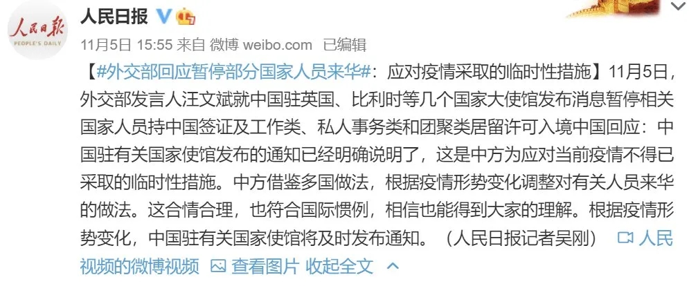 此外,根據(jù)中國大使館的通知,持有外交、公務(wù)、禮遇和C簽證的人員不受影響。外國人如有特殊緊急需要來華,可向中國駐外使(領(lǐng))館申請(qǐng)簽證,持2020年11月3日后簽發(fā)的簽證入境不受影響。