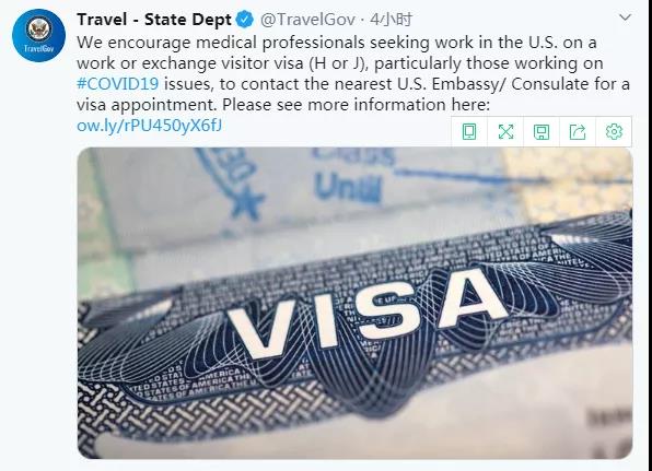 文中寫道,我們鼓勵(lì)尋求在美工作或交流的專業(yè)醫(yī)療人員,尤其是那些致力于治療或緩解新冠肺炎疫情的專業(yè)人員,與就近使館或者領(lǐng)事館聯(lián)系申請(qǐng)簽證。