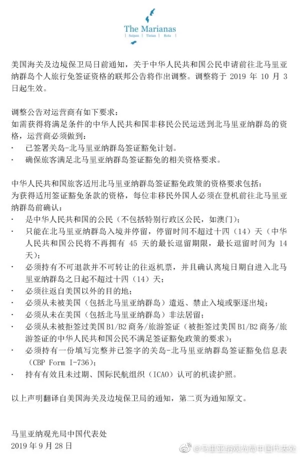 據(jù)@馬里亞納觀光局中國(guó)代表處 發(fā)布的最新消息,關(guān)于中華人民共和國(guó)公民申請(qǐng)前往北馬里亞納群島個(gè)人旅行免簽證資格的聯(lián)邦公告將做出調(diào)整。調(diào)整將于2019年10月3日起生效。