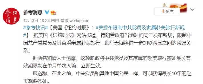 隨后,國內(nèi)報(bào)道此次被限制出行人員是中國共產(chǎn)黨黨員及家屬,這部分人的赴美簽證最長有效期將從10年變?yōu)楫?dāng)月當(dāng)次。