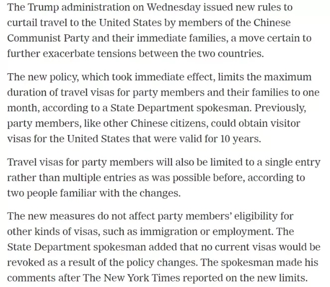 其實(shí)在7月,報(bào)道稱美國透露過更為嚴(yán)格的政策:吊銷在美國中共黨員及其家屬的簽證(將會(huì)導(dǎo)致相關(guān)人員被驅(qū)逐出境);限制中國軍隊(duì)和國企高管赴美旅行。