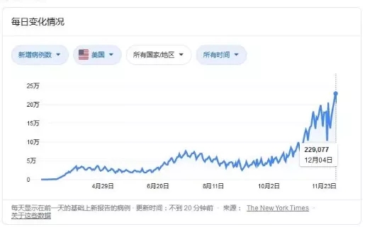 根據(jù)《紐約時(shí)報(bào)》12月6日的數(shù)據(jù)顯示,在過去5天內(nèi),美國新增病例超100萬,過去一周的死亡病例達(dá)2010人,為4月以來最高水平。