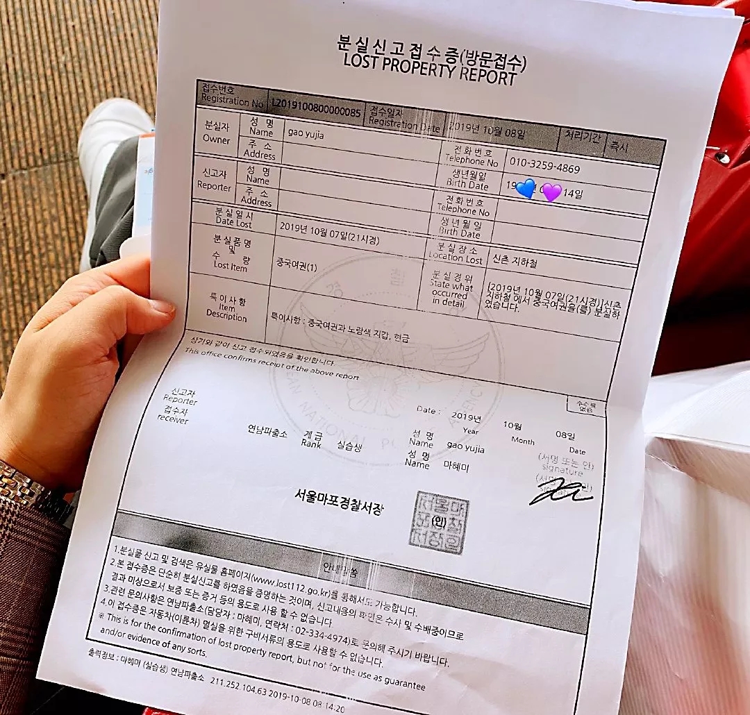 第二天一早去警察局👮♀️報案登記,填了信息我要了一張遺失護照證明,就去了領事館(⚠️注意是中國駐首爾大使館領事部,千萬別走錯)去之前準備好證明身份的(身份證等進大使館會有人查看才讓進)➕韓元現(xiàn)金,流程:排號——填兩張資料——拍照(有自備證件照的可以不用,現(xiàn)場拍照的話只收韓元1W)——叫號在窗口說明情況,把自己說慘一點并加急處理——拿到臨時簽證申請單(粉紅色)——等電話(一般下午三四點左右打電話五點前都可以拿到)——繳費拿證(5.5w韓元🉑️微信支付寶付款)