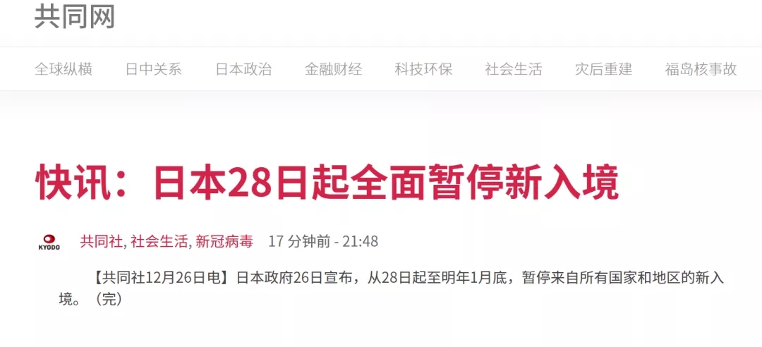 日本共同社剛剛消息稱,日本政府26日宣布,從本月28日起至明年1月底,暫停來自所有國家和地區(qū)的新入境。