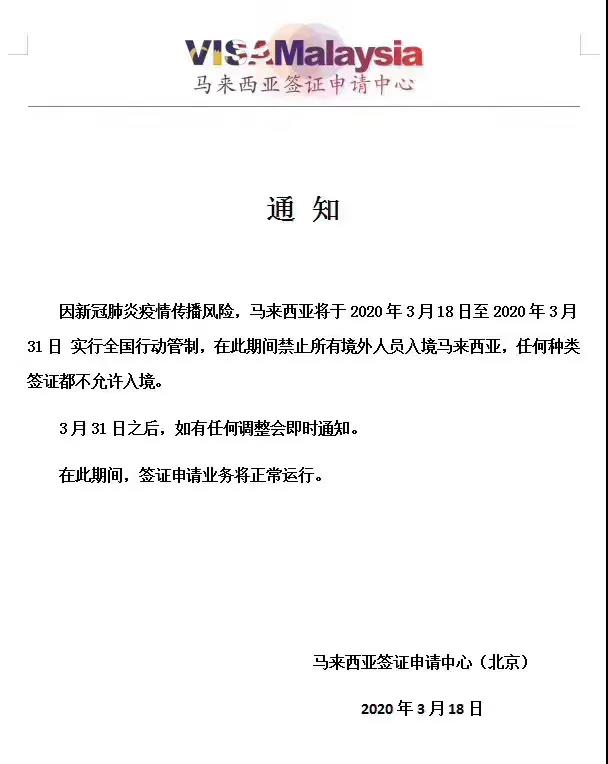 馬來西亞將于3月18日至3月31日禁止任何種類簽證的境外人士入境!