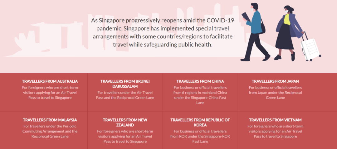 新加坡與一些國(guó)家/地區(qū)實(shí)施了特別旅行安排,以促進(jìn)該國(guó)公民前來(lái)新加坡旅行,同時(shí)保障公眾健康。特批的國(guó)家/地區(qū)包括:澳大利亞、文萊、中國(guó)、日本、馬來(lái)西亞、新西蘭、韓國(guó)、越南。